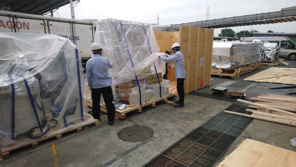 Đội ngũ kỹ thuật sử dụng xe cẩu, xe nâng, rùa dịch chuyển, kích thủy lực và thiết bị chuyên dụng để di dời máy móc. Hệ thống điện, khí nén, nước được đánh dấu và tháo rời cẩn thận. Hàng hóa được đóng gói bằng vật liệu chuyên dụng (pallet gỗ, màng PE, đệm khí) để chống sốc và va đập.